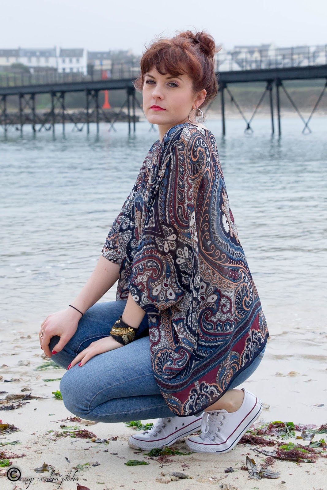 Ce top imprimé, je voulais le porter avec un vieux short un peu déchiré et la ceinture pompon…mais je pense que malgré les talents du photographe, on aurait tout de même vu sur les photos que j’avais la chair de poule !  Bref, autant avec un short en plein été comme avec un jean ou un pantalon blanc et des compensées, ce top est idéal. Il convient à toutes les morpho. Doublé avec un tissu très près du corps, on peut faire la roue sur le pont d’Audierne sans dévoiler son ventre (je ne sais pas faire la roue mais je vais m’entraîner). En parlant de ce pont, c’est celui duquel je plongeais lorsque j’étais petite (si j’ai une photo, je vous la montrerai, promis).