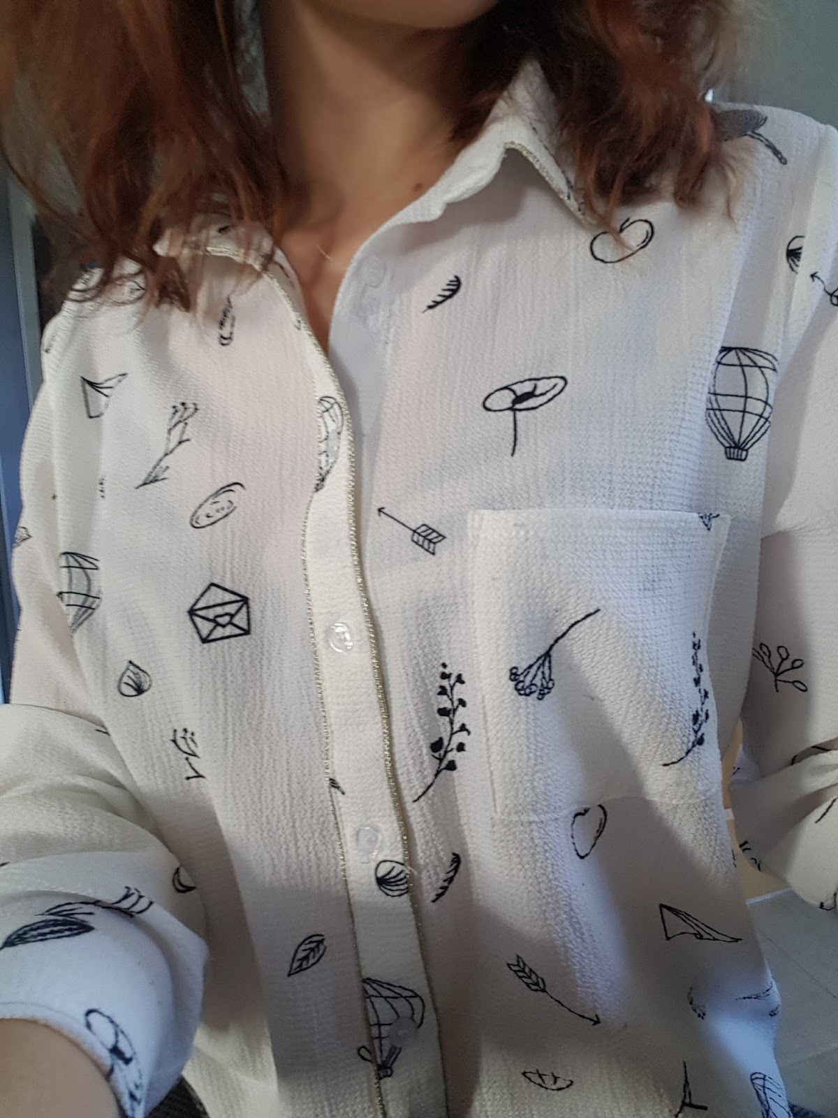 En gros plan, vous verrez mieux le motif de mon pantalon, imaginerez mieux la matière de mon chemisier et pourrez admirer mon reflet déformé dans mon joli bracelet Skagen, apporté par le Père Noël également. Il est en cuir et en acier rose gold. Joli hein ? Je l’ai trouvé en noir ici.