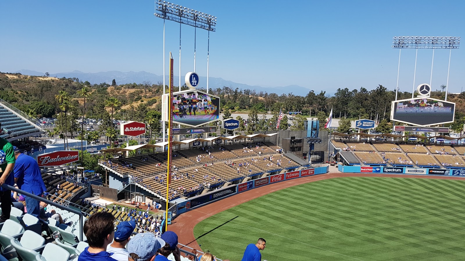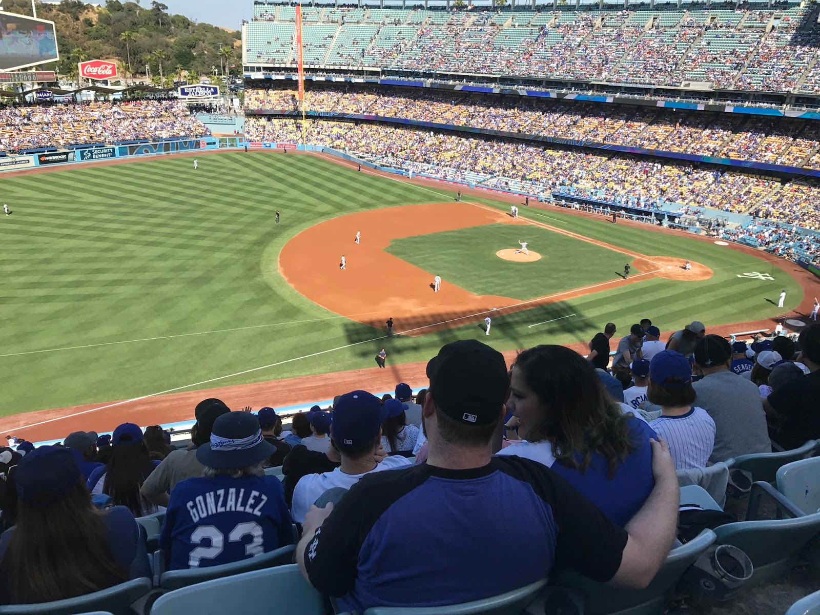 Le stade se remplit doucement. Le match commence… Evidemment, je ne comprends rien. Pourtant, j’ai lu les règles du jeu mais bref, c’est lent…mais leeeeeeeeent. Il y a très peu d’actions. Les gens vont et viennent avec plein de bouffe. Le gars près de moi est avec son fils. Il arrive avec un énorme paquet de chips, un autre de cacahuètes. Il mange tout en en mettant partout puis part acheter une casquette Dodgers en plastique remplie de nachos au cheddar. Puis il repart et revient avec une barquette de frites et un hot dog (son fils mange à chaque fois à peu près pareil que lui)…puis ça n’en finit pas : pop corn, burger, bières… je suis sidérée par le montant dépensé en nourriture pendant ce laps de temps. Il faut savoir qu’un match peut durer 3h. Alors le gars n’a pas arrêté de manger une seule minute.  C’est assez marrant comme concept : les gens discutent, partent, reviennent, c’est très familial. Beaucoup de familles, de bébés…. Les gens ne regardent pas forcément le match mais discutent entre eux. Des fois, lorsque l’orgue joue un petit air pour annoncer telle ou telle action, les gens applaudissent un peu…C’est totalement différent d’un match de foot chez nous.