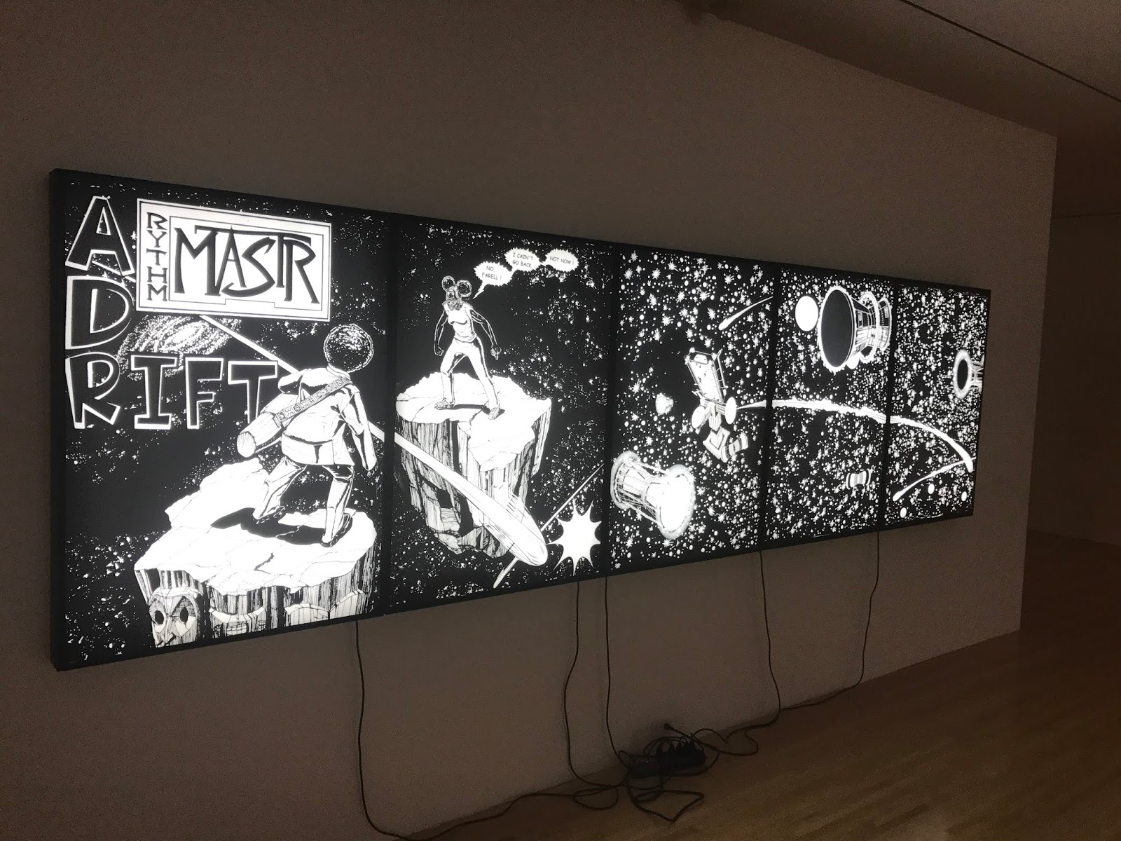 Il y a cette pièce où sont installées des planches en noir et blanc, illuminées. Ce sont des scènes très graphiques de science fiction.