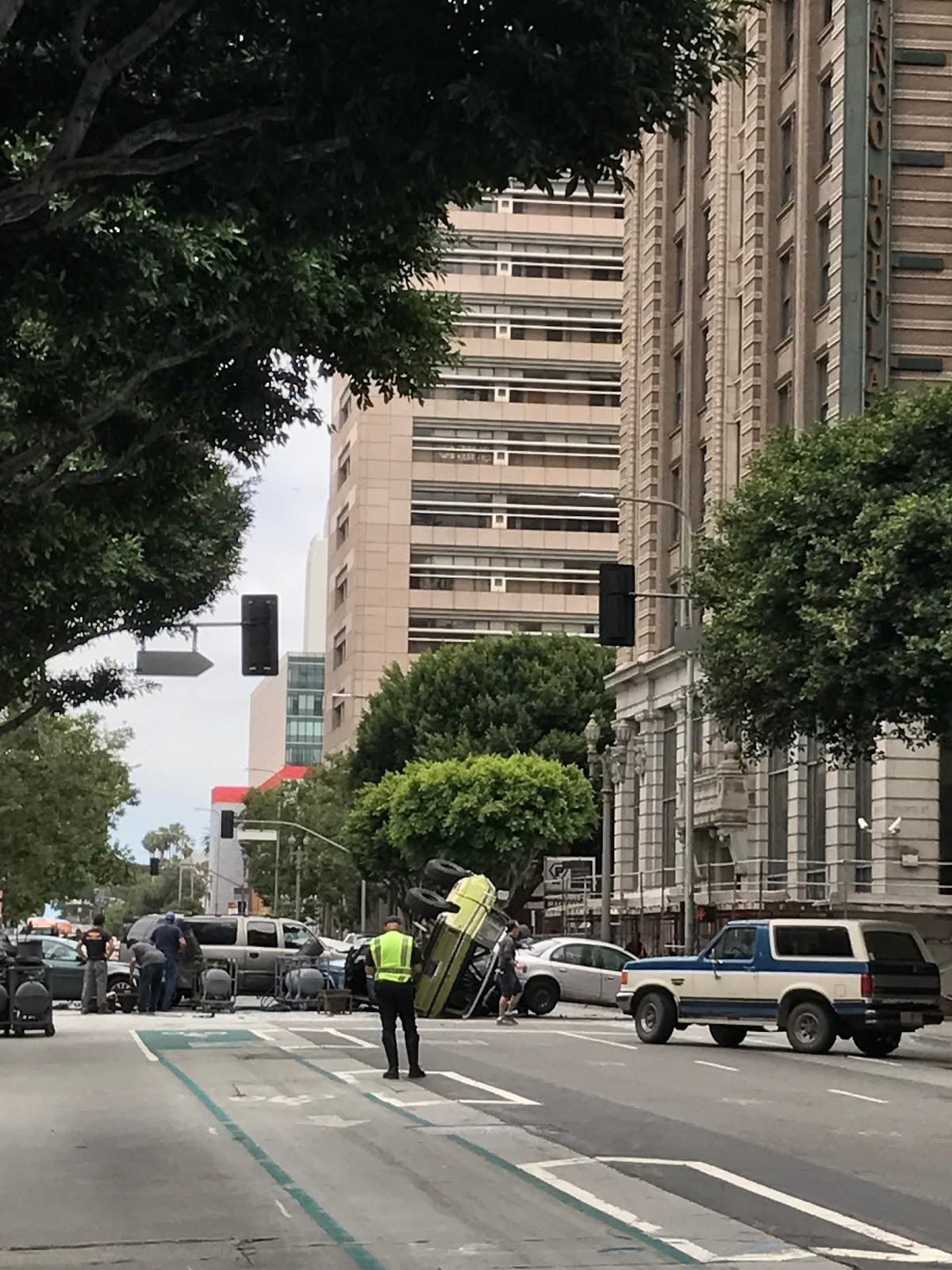 Nous traînons dans Downtown, direction The Last Bookstore. La route que nous devons epmprunter est barrée par un policier qui nous indique qu’il y a un tournage ! Génial !notre curiosité nous pousse à regarder un peu plus loin : on aperçoit une voiture renversée sur le côté…des caméras, des techniciens s’affairent à créer de la fumée. On contourne la rue pour pouvoir accéder par l’autre côté. Un des technicien nous explique que c’est un tournage de publicité. J’ai une photo, tenez :