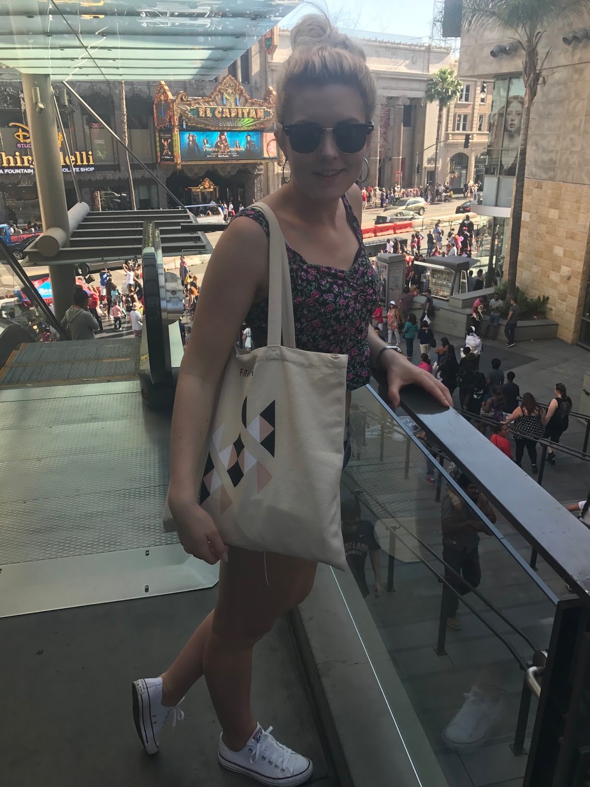 On traîne sur Hollywood boulevard et on s’arrête dans un énorme center commercial, le Hollywood and Highland Center. C’est énorme ! on rentre dans les boutiques, on boit un coup devant 2 gros éléphants et un énorme sarcophage …ils ont été édifiés pour la promo du film La Momie. Dingue ! c’est énorme ! On passe un temps fou dans une boutique hyper geek : vêtements et goodies correspondant à des séries (Big bang theory…) ou des films du style Harry Potter ou encore des Disney, Marvel…. Du sol au plafond : casquettes, tee shirts, maillots de bain… je remarque un magasin Sketchers. En plein Hollywood boulevard. Je trouve cela super moche (qu’en dites vous, vous ?) mais ici, c’est assez répandu, je vois plein de mon avec des Sketchers…je ne comprends pas… J’en avais à mes 14 ans, mais là, franchement…non, je ne comprends pas.Je me trouve un joli short à lacets chez Forever 21. Je le mettrai demain avec mon débardeur tête de mort. Il y a des promotions partout pour le Memorial day. La boutique est sans dessus dessous, c’est dingue !