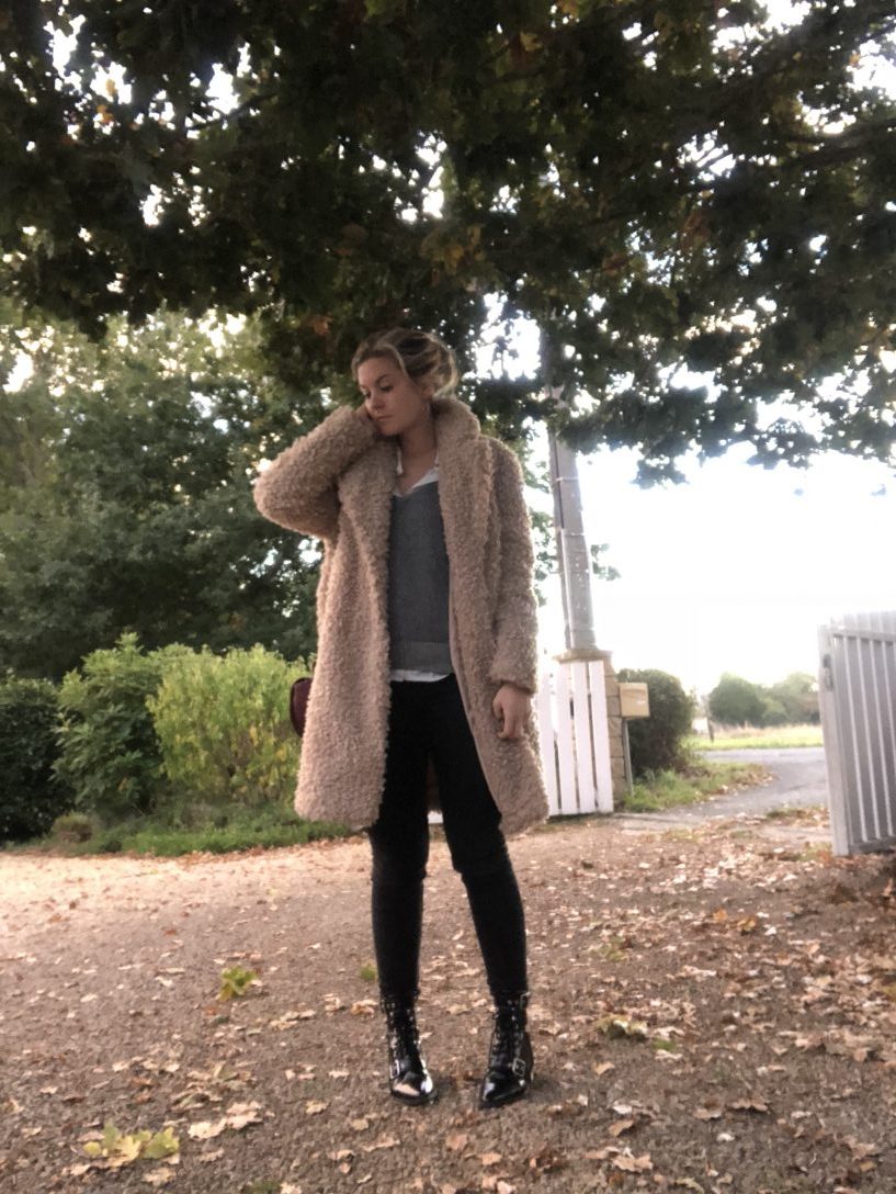 Je suis frileuse (mais pas depuis longtemps…ce qui m’intrigue d’ailleurs) et le fait de me sentir bien au chaud tout en aillant la classe, et bien je trouve ça important. J’ai déniché ce manteau teddy bear sur Vinted. Il s’agit d’un H&m qui était à 79,90€ à l’origine et que j’ai eu pour 25€. Il y avait encore l’étiquette du prix (intacte) 🏷 sur la pièce ! Je le trouve vraiment chouette et je trouve que sa longueur est idéale pour ma morphologie. On dit que c’est esprit “teddy bear” mais Katia, alias “les déboires de Carlita” m’a demandé pourquoi j’avais mis une brebis sur mon dos. C’est vrai que cette couleur me fait plutôt penser à un mouton (bêêêêh) qu’à un petit ours, soyons honnêtes.
